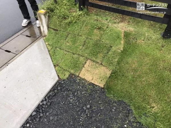お庭と駐車スペースの間の法面に、綺麗な天然芝を張られていましたが、一部が崩れてしまっていました。土を盛り、天然芝で補修させていただきました。