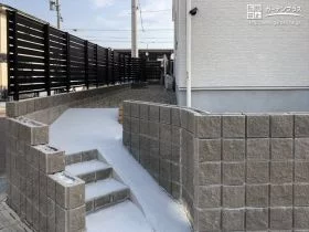 建物と道路の間に高低差があるため、法面にして芝生と低木を植えられていましたが、土留めブロック塀へリフォーム。型枠ブロックで強度のある土留めを作り、木目調の目隠しフェンスを施工しました。境界ぎりぎりまで利用面積を広げたお庭リフォーム工事です。