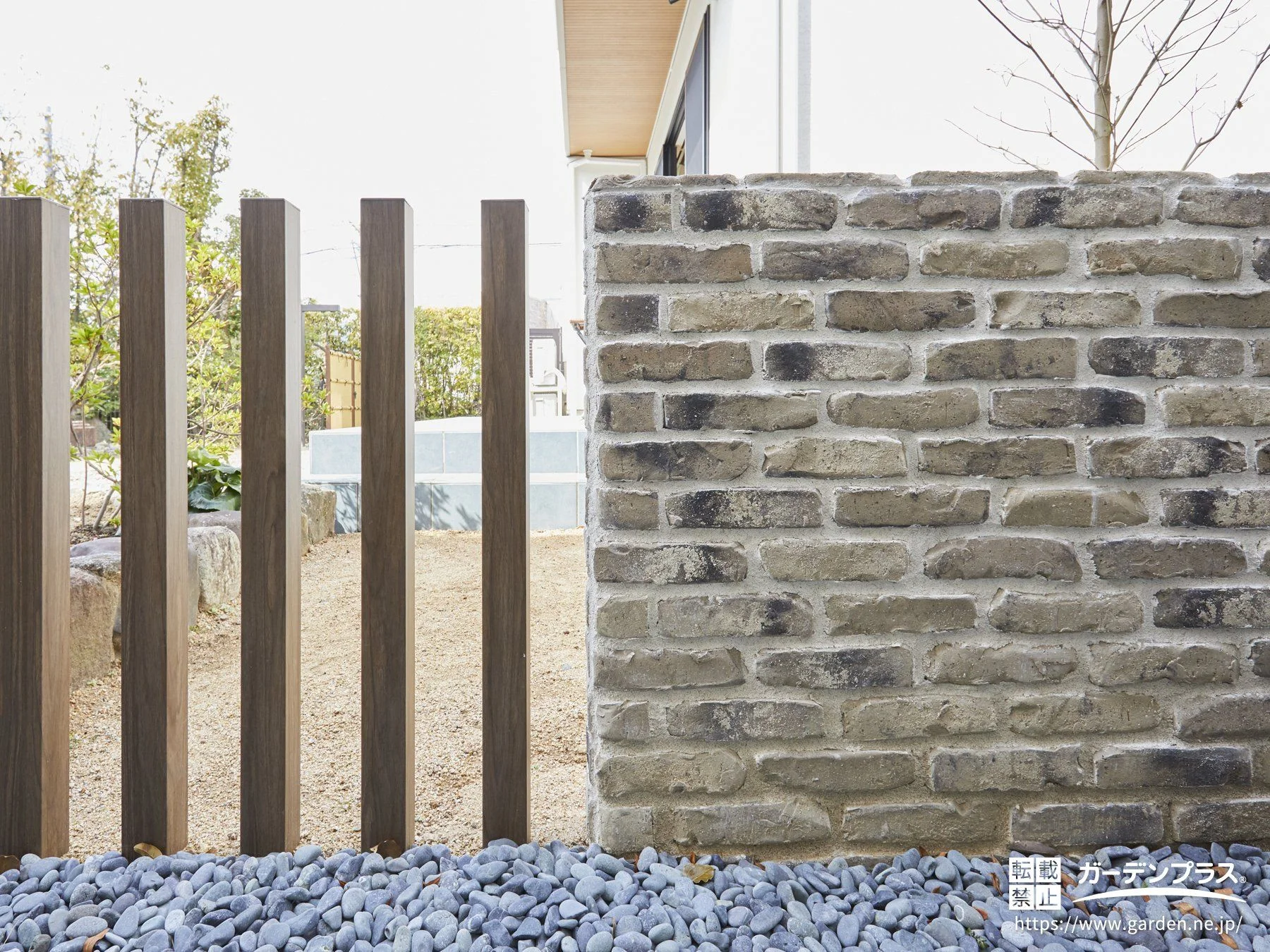 レンガ塀から続く境界の一画に角柱を並べました。横に並べた角柱が、視界を遮らずにさりげなく境界を示します。またガラスブロック同様、光を届ける役割も兼ねています。木調の角柱が温かみあるレンガにぴったりです。