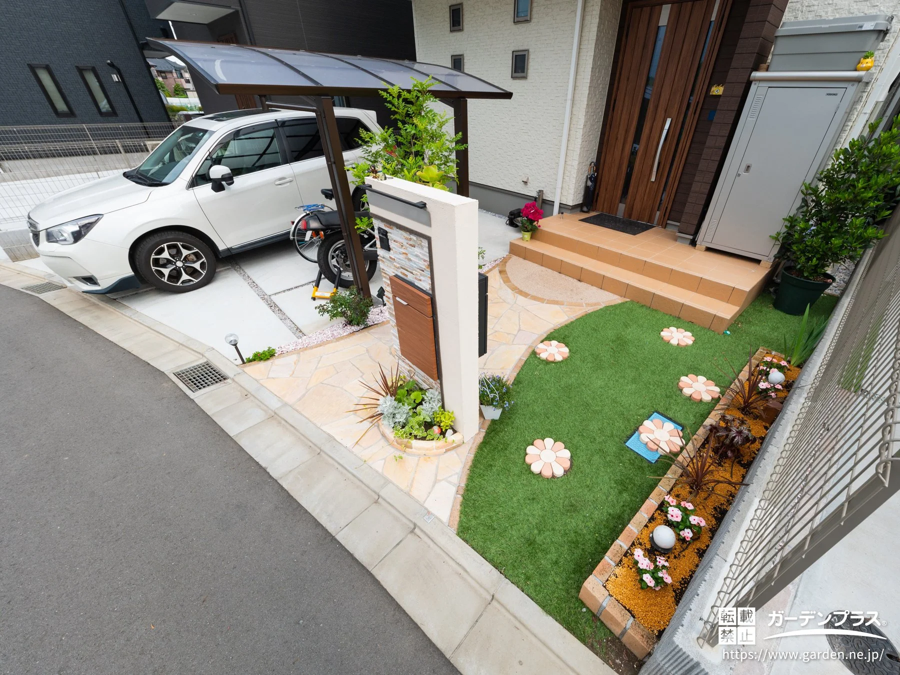 新築外構一式工事を承りました。門柱は塗り壁に天然石パネルをアクセントにあしらい、石材の繊細さとダイナミックさを演出。前庭は人工芝にお客様御支給品のお花モチーフの飾りを合わせ、かわいらしいナチュラルテイストのお庭に仕上げました。