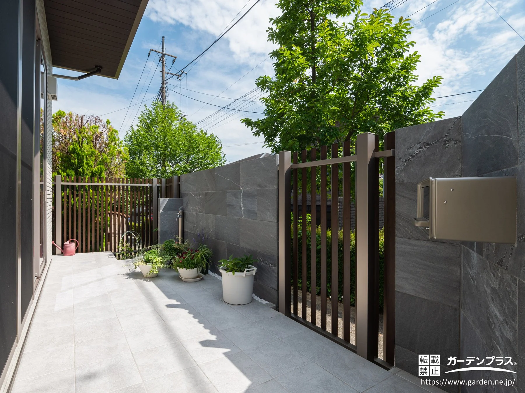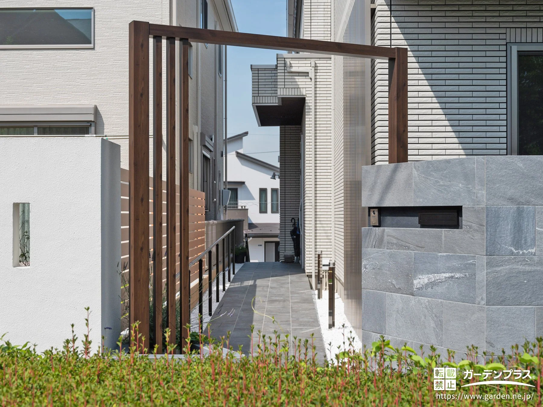 新築外構一式工事を承りました。駐車スペースが建物裏側にあり、掃き出し窓と道路との距離が近いため、目隠しとして石調タイルを貼った塀を設置。大判のタイルで格調高さを出しつつも、縦格子のスリットフェンスを合わせて抜け感も出しました。アプローチのフレームゲートが訪れる人の高揚感を高めてくれる、モダンなオープンスタイルの新築外構デザインです。