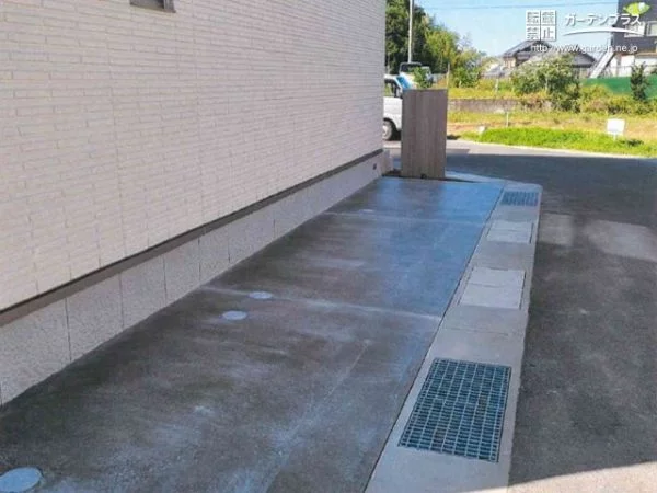 門柱裏のスペースも土間コンクリートで舗装し、車を横づけしたり駐輪スペースとしてご利用できるようにしました。雑草対策にも効果的です。