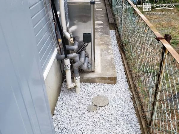 給湯設備が設置された犬走りにも雑草対策をしました。砂利の効果で水が溜まりにくくなるので、清潔に保てます。