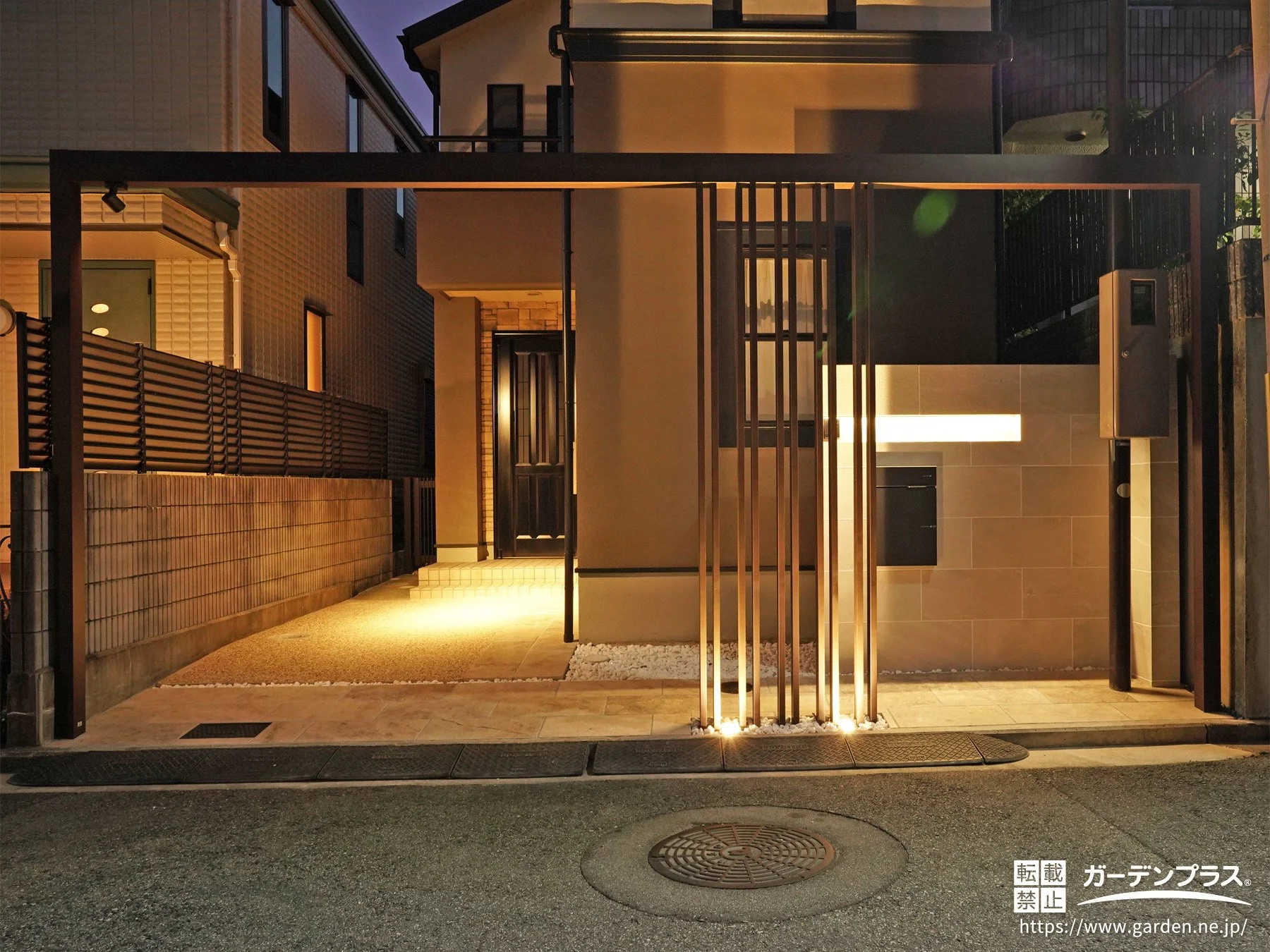 お庭のリフォーム工事を承りました。オープン外構にフレームエクステリアを組み合わせ、駐車の快適性を保ったまま敷地境界を明示。フレームの縦格子と門柱をずらすことで、奥に続くお住まいの外壁から玄関へと段階的に面が重なり、奥行を感じるファサードに生まれ変わりました。夜は照明がリズミカルな陰影をつくりだす、幻想的な門まわりに仕上げています。