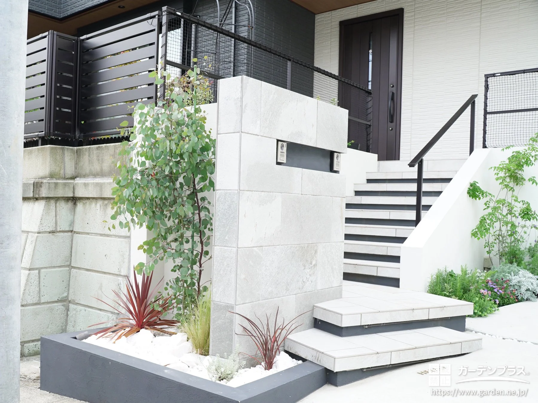新築の二世帯住宅の外構工事をご依頼いただきました。頑丈な擁壁に囲まれた敷地で、建物と道路面との間に大きな高低差がありましたので、ステップ数の多いアプローチ階段をファサードの主役としてプランニングしています。駐車スペースや全面道路からできるだけスムーズに階段を登れるように、最初のステップを建物に対して斜めに配置。門柱や周りの門柱や土留めは建物に対して垂直・平行なラインに揃えていますので、視覚的にも変化があり個性を感じられるデザインです。施主様がガーデニングがお好きとのことで、門まわりには植栽スペースも配置。緑が映えるように白をメインとしたモノトーンで、上品に仕上げた新築外構です。