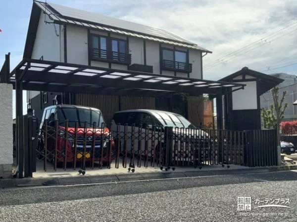 駐車スペースにカーポートとカーゲートを施工させていただきました。お車3台分の広さの駐車スペースでしたが、前の道路に合わせて勾配がつけられていたため、カーゲートには傾斜地用の伸縮門扉を採用。カーポートは3台分の大きさにして、スペース全体を覆いました。立派な和風のお住まいでしたが、カーポートの格子状に組まれた梁材や、カーゲートの木目デザインを施した縦格子が見事に調和しています。