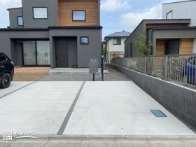 新築のお住まいの駐車スペースと主庭の外構工事をご依頼いただきました。広々とした駐車スペースは、コンクリートで舗装し一面フラットに。目地に施工したインターロッキングがシンプルなコンクリート舗装のアクセントとして、また駐車する際の目印として便利に活用できます。さらに、駐車スペース横には土留めを設置。お子さまと一緒にお庭づくりを楽しめるよう整地しました。