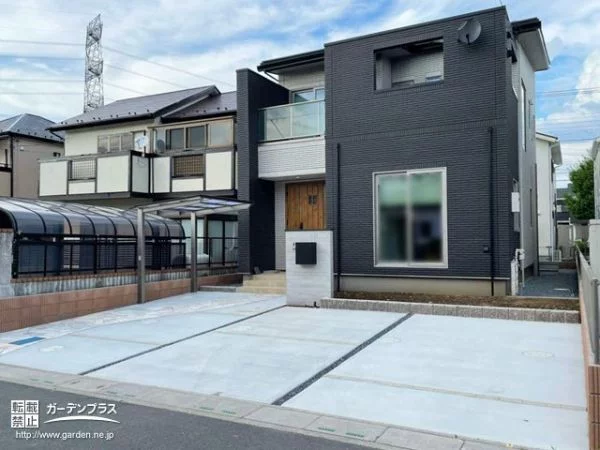 新築戸建ての外構工事を承りました。建物正面には、駐車スペースや駐輪スペースを設け、土間をコンクリートで舗装しています。目地をインターロッキングで仕上げることで、単調なデザインにならないようひと工夫。また、広くお車を駐車できるようにアプローチ側までコンクリートを打設し、強度を持たせました。アプローチはやわらかい雰囲気の乱形石を施工して、玄関までの足元を上品に。デザイン門柱を設けた裏側のスペースを主庭として使えるよう、土留めを設置しました。車止めとしての役割も担うので、安心してお庭を活用できます。舗装材の仕様を変えて、敷地全体に雑草対策を行い、毎日の家事を楽にする新築外構です。