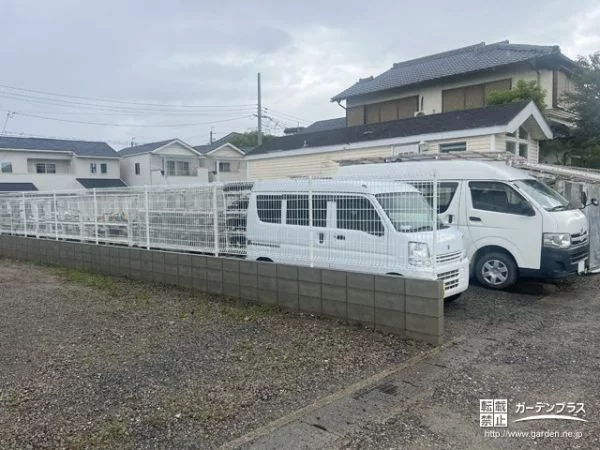所有されている植物の管理スペースに、外周フェンスを設置したいとご依頼をいただきました。南北が道路に隣接していましたが、北側にはかなり大きな土留め擁壁を設けられており、今回はまず東・北・西面に土留めを兼ねたブロックを積むところから作業させていただきました。既存の擁壁に影響しないよう、擁壁内側に頑丈な基礎とブロックを施工してから風通しのよいメッシュフェンスを設置しています。また場内は商品棚を移設してから整地し、砕石を敷設しました。砂利の層が厚くなったことで排水性も高まり、水たまりができにくくなります。