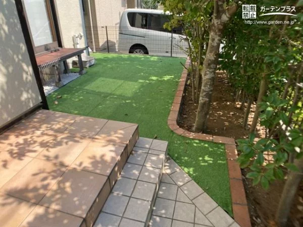 雑草対策のためにお庭を人工芝にしたいとご依頼をいただきました。以前は芝生を張られていましたが、手入れが行き届かなくなってしまったとのことで、お手入れいらずの人工芝へリフォーム。下地には防草シートも使用し、一年中すっきりしたお庭になりました。また勝手口側の裏庭も同じく人工芝にしています。ストレスフリーになった分、お庭に出る機会も増える外構リフォームです。