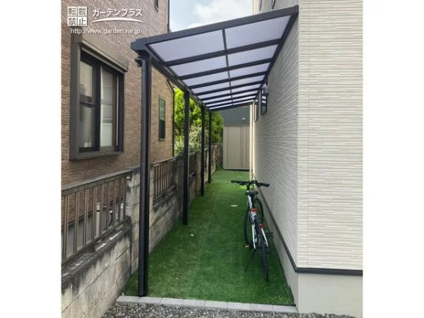 駐輪スペース用の場所が欲しいとのことでお客様からご相談をいただきました。まずは犬走に紫外線をほぼ100%カットできるテラス屋根を設置。また光が入りにくい場所でしたが、ポリカーボネート性の屋根のため、光を透過し、明るさも保てます。犬走りの幅に合わせたサイズに調整しましたので空間を最大限に使用でき、雨風や日差しから大切な自転車を守ることができます。
