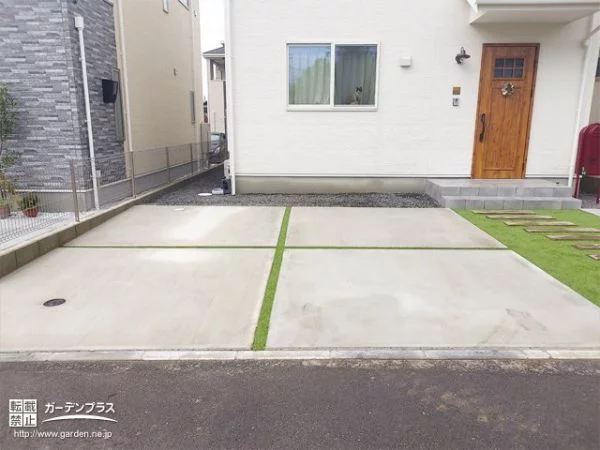 駐車スペース:土間コンクリート 刷毛引き仕上げ + スリット 人工芝