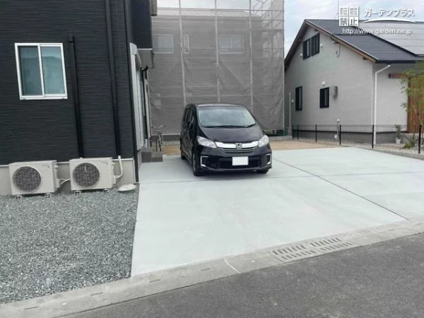 建物基礎と道路との間にブロック1段分の高低差がありましたが、駐車スペースの土間コンクリートをスロープ状に打設することで解消させました。駐車スペース奥はお庭として利用できるように山砂で整地しています。