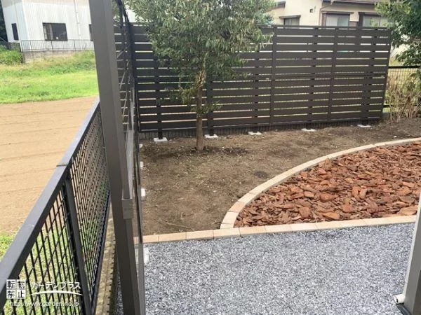お庭の雑草対策、目隠しフェンスの設置をしたいとお客様からご依頼いただきました。ワンちゃんと過ごしやすく、ガーデニングが楽しめるお庭の外構プランをご提案。リビングに面している主庭のテラス周りには土間コンクリートやウッドチップで施工し、やわらかな曲線で仕上げました。ウッドチップの中でもサイズが大きく角が丸いバークチップを採用して、小型犬でも安全に歩けるように配慮しています。さらに外側は植栽スペースとして残しました。見通しのよかった主庭の一画には目隠しフェンスを設けて、内側のプライベート空間を確保しています。ワンちゃんも快適に遊べて、ガーデニングも楽しめるナチュラルなお庭が完成しました。