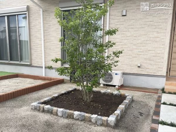 アプローチの隣にピンコロ石で囲った植栽スペースを設けました。3色のピンコロ石を組み合わせており、天然石特有の自然な凹凸感がナチュラルな門周りに溶け込みます。ソヨゴは常緑樹でありながら、白い花や赤い実を楽しめ、実を食べに来る鳥を観察することもできます。日陰にも耐える丈夫な性質もあり、シンボルツリーにもおすすめの樹木です。