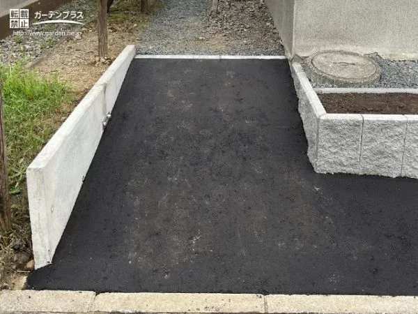 玄関アプローチ南側は法面になっているため、隣地境界に沿ってL型ブロックで土留めを行い、アスファルトでスロープを作りました。犬走りまで通りやすくなりました。