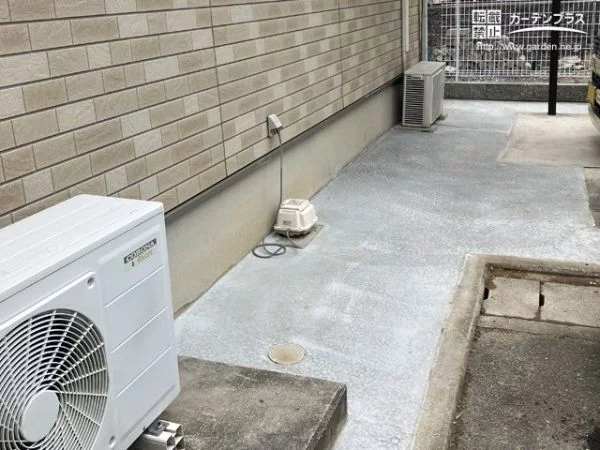 駐車スペースの周りや室外機の下に土間コンクリートを打設しました。既存の土間コンクリートに合わせた高さに、お車がサイズアップしたときやバイク・自転車を停めるときも安心です。