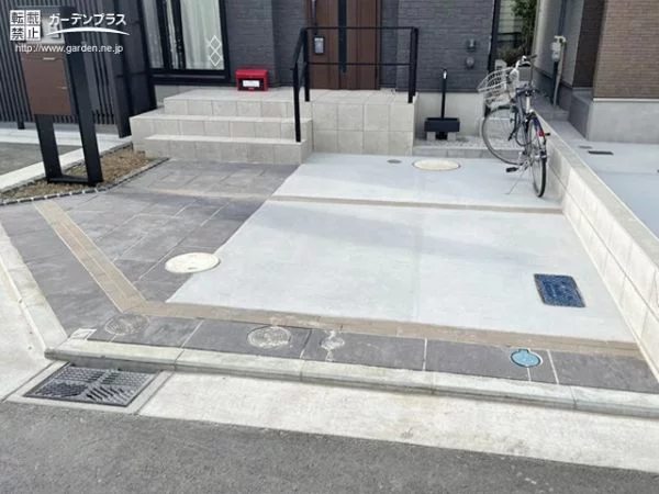 駐車スペースインターロッキング目地:東洋工業 エクレル ダークグレー + 東洋工業 エクレルボーダー ナチュラルブラウン
