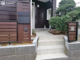 既存門柱の上5段分を撤去し、機能門柱を新設しました。木目調の落ち着いたブラウンのお色味がやすらぎを与えるデザインです。またアプローチにはホワイトのタイルをあしらい、明るい印象に。タイルは汚れが落ちやすく、ローメンテナンス化できます。