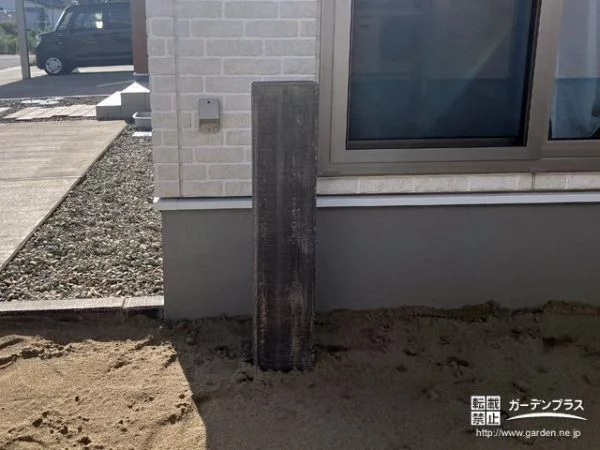 東側のお庭はこれから施主様でお庭づくりをされるとのことで未舗装の状態です。掃き出し窓の前には、アプローチの枕木材と同じ、コンクリート製の擬木を立てました。実は、わんちゃんが車道に飛び出さないようリードを引っかけるドッグポールとして使われるそうです。オープン外構でもわんちゃんとお庭で過ごせるアイデアです。