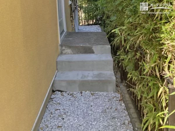 勝手口前の既存のコンクリートステップはアプローチ側の動線しかなかったのですが、お庭側の動線として、ステップを2段施工しました。2つの動線が確保されたことで、お庭内をスムーズに行き来できます。