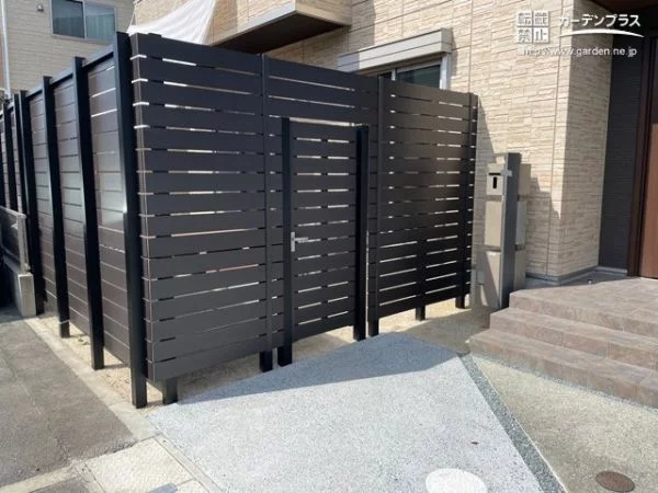生垣を解体し、既存の木目調フェンスに合わせてフェンスを延長させました。L字型にしてお庭の出入口を囲みましたが、駐車スペースとも行き来ができるように一部を門扉にしています。背の高いフェンスですので、強風時に倒れることがないよう基礎もしっかり施工させていただきました。