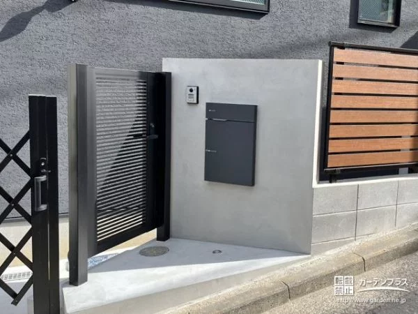 新築外構一式を承りました。傾斜が急な道路沿いのお住まいに合わせた外構プランをご提案。駐車スペース正面に傾斜でも施工できる、伸縮門扉を採用しています。隣の門扉やモルタル塗りの門柱を設けたことで、安全性の高いクローズ外構に仕上がりました。角度を付けて設置しているため、内側の待機スペースを確保し、安全面にも配慮しています。また駐輪スペース正面に目隠しフェンスを設置したことで、生活感を感じさせないデザインに。モダンな雰囲気に木調を取り入れたことで、自然の温かみがプラスされました。グレーのお色味の建物に合わせて、ブラックを基調としたシンプルでモダンな外構に仕上がりました。