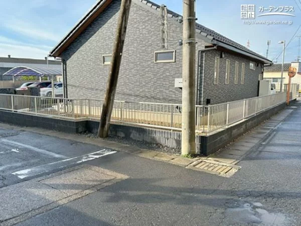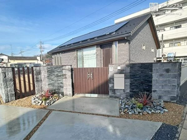 新築外構一式を承りました。グレーの外壁のお住まいに似合うセミクローズ外構をご提案。オープンスペースとなる駐車スペースは土間コンクリートで舗装し、斜めスリットがスタイリッシュな仕上がりです。門柱や門扉も建物正面から少し斜めにレイアウトしたことで、玄関前からの動線だけでなく、意匠性の高い門周りになっています。リブブロックにアクセントとして天然石のタイルをあしらい、木目調の門扉や枕木材を配置。フォーカルポイントにロックガーデンを設けて、シックで重厚感のある雰囲気を演出することができました。またお住まいを境界フェンスで囲ったことで、建物周りをクローズ化。門柱のレイアウトバランスを工夫した、スタイリッシュな新築外構となりました。