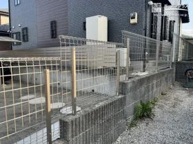 駐車スペースの境界塀の上に、メッシュフェンスを設置しました。高さの違うブロックに合わせてカット加工しています。