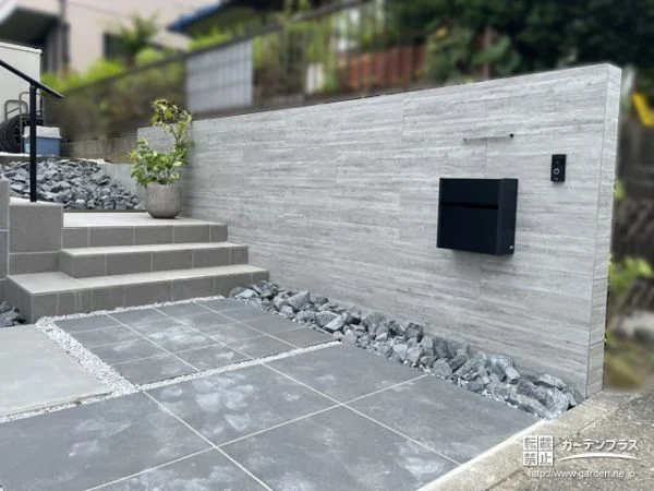 新築のお住まいの外構工事をご依頼いただきました。深基礎の建物で、特徴的なL字型のポーチ階段が既にハウスメーカー様にて施工されていましたので、この階段を中心に門まわりをデザイン。隣地境界に設けられていた既存の大きなブロック塀は高級感のあるタイルを貼ってリフォームし、ポストや表札を取り付けました。またお住まいに合わせてモノトーンに統一された門まわりでしたが、植栽スペースにはシンボルツリーとなるアオダモを植栽。瑞々しい緑がグレーカラーによって引き立ち、爽やかでモダンな雰囲気を演出してくれました。