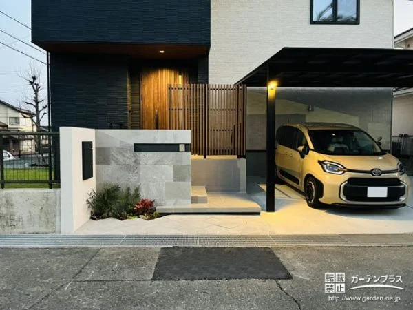 新築のお住まいの外構工事をご依頼いただきました。道路と建物まわりの間に法面があり、大きなポーチ階段や土留め擁壁・境界フェンスがハウスメーカー様にて施工されていました。当店では高級感のあるポーチ階段を中心に、土留めを兼ねたL字型門柱や、アプローチ、駐車スペースなどを外構プランをご提案。モダンなフラット屋根のカーポートは、屋根をできるだけ建物に近づけて、雨の日も快適に乗り降りできるように調整しました。またポーチ階段には蹴込をつけたステップを1段追加し、更にグレードを高めたデザインに。大きな門柱にはラインライトを組み合わせ、夜間もタイルや植栽の質感を楽しめる外構に仕上げさせていただきました。