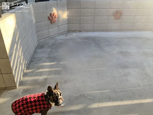 "お庭にワンちゃんのためのドッグランをつくりたい"とお客様からご依頼いただきました。お庭をプライベートスペースにするため、ブロックフェンスを施工。内側はコンクリートテラスにしたことで、お洗濯物が干しやすく、わんちゃんの足も汚れません。内側の生活感を感じさせず、ワンちゃんがのびのび遊べる空間が完成しました。