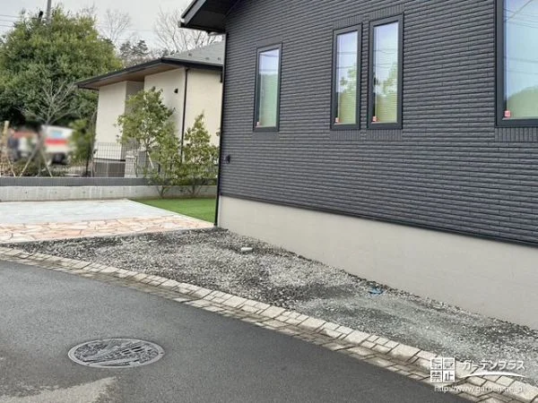 お住まいが変形地となっており、建物正面の細長いスペースは雑草を防ぐため、防草シートの上に砂利を敷きました。砂利は踏みしめると音が鳴るので、防犯対策にも役立ちます。また来客者様用の駐車スペースとしても活用できるようになっています。