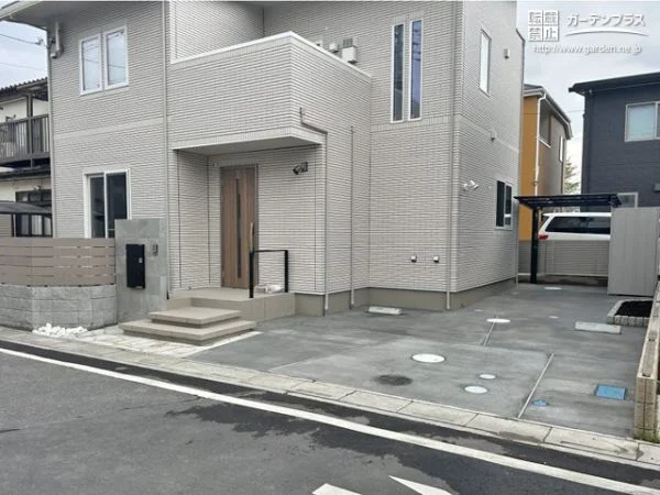 新築のお住まいの外構工事を承りました。ベージュ系のナチュラルなお住まいのお色味に似合う外構プランをご提案。駐車スペースは土間コンクリートで舗装し、伸縮目地をアクセントとして斜めに配置しました。後方の空間はサイクルポートを設けて、駐輪スペースに。物置も設置しましたので、これから増えていく趣味の用品などを収納していただけます。また門周りは明るめのグレーやベージュを配置し、ナチュラルモダンな印象に。タイル門柱や浮き階段が高級感を演出しました。シンプルながらグレイッシュなカラーでバランスを取ったシンプルモダンな新築外構です。