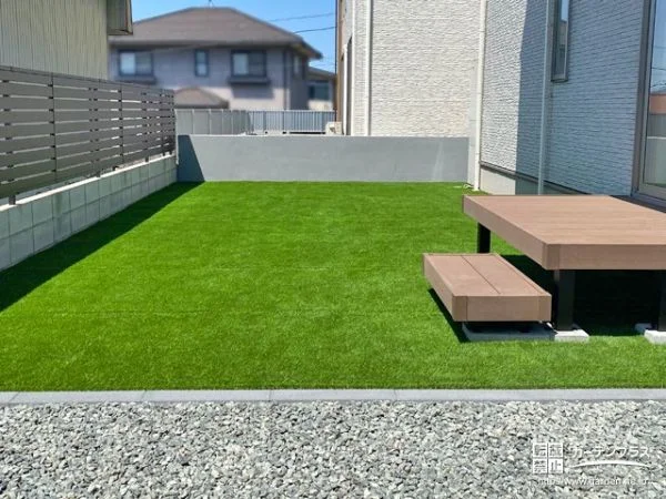 “お子様と一緒に過ごしやすいお庭がほしい”とお客様からご依頼いただきました。土のままだったお庭は、フカフカと足触りの良い人工芝を敷設。お庭に面した掃き出し窓には、コンパクトサイズの人工木デッキを設置しました。また、隣地境界にあった境界塀が無機質で浮いてしまっていましたので、柔らかなグレーで塗装仕上げに。お部屋からの眺めも素晴らしく、温かみのあるお庭が完成しました。