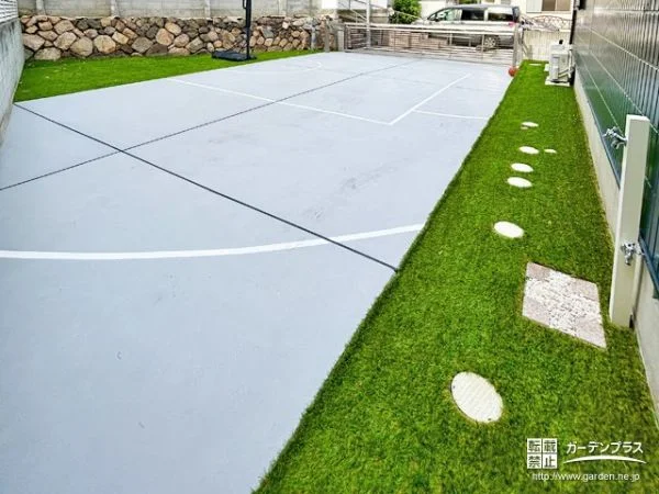 ”駐車スペース兼バスケットコートをつくりたい”とお客様からリフォーム工事をご依頼いただきました。広々とした駐車スペースには耐久性の高い土間コンクリートを打設し、バスケットコートのラインを引いて仕上げています。周りに人工芝を敷いたことで、ナチュラルで明るい雰囲気を演出しました。また間口を広げるため、ブロックや伸縮門扉を撤去し、カーゲートを新設。お子様の飛び出し防止にもなり、敷地内でのびのび遊べるようになっています。最後に御支給いただいたバスケットゴールを設置し、遊びも楽しめる駐車スペースの完成です。