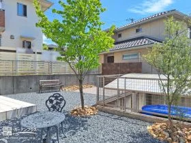 主庭にウッドデッキを施工しました。再生木を使用したデッキは腐食や虫害の心配がなく、安心してお使いいただけます。お手入れのしにくいデッキ下には土間コンクリートを打設して雑草やぬかるみを防止。頭上にはテラス屋根を設置したため、雨を気にせずお過ごしいただけるほか、熱線遮断ポリカーボネート屋根をセレクトしているので夏場も屋根下の温度が上がりすぎることを防ぎ、快適にお過ごしいただけます。お子様がビニールプールを出して遊んだり、机や椅子を出して寛ぐ家族団らんのスペースができました。また、駐車スペースの一画にはサイクルポートを施工し、自転車を雨風、紫外線から守っています。
