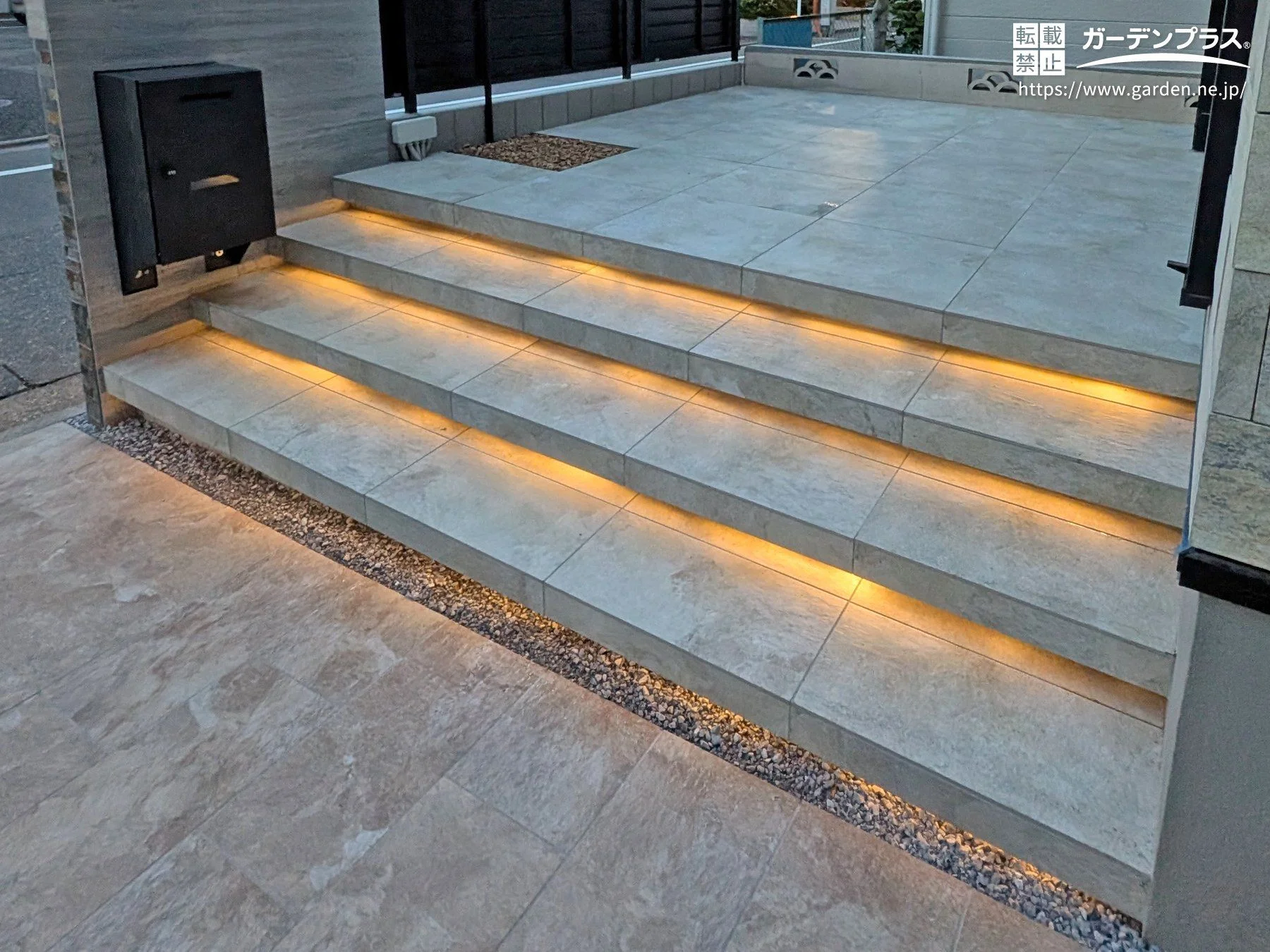 主庭への入り口となるステップは、下地をコンクリートブロックで組み、蹴込と踏面をタイルで仕上げました。段差部分にはバーライトを仕込み、夜間は足元をやさしく照らして安全性を高めつつ、幻想的な雰囲気を演出。タイル張りのアプローチから主庭へとつながることで統一感が生まれ、昼は明るく上質に、夜は光が際立つ印象的な空間になっています。