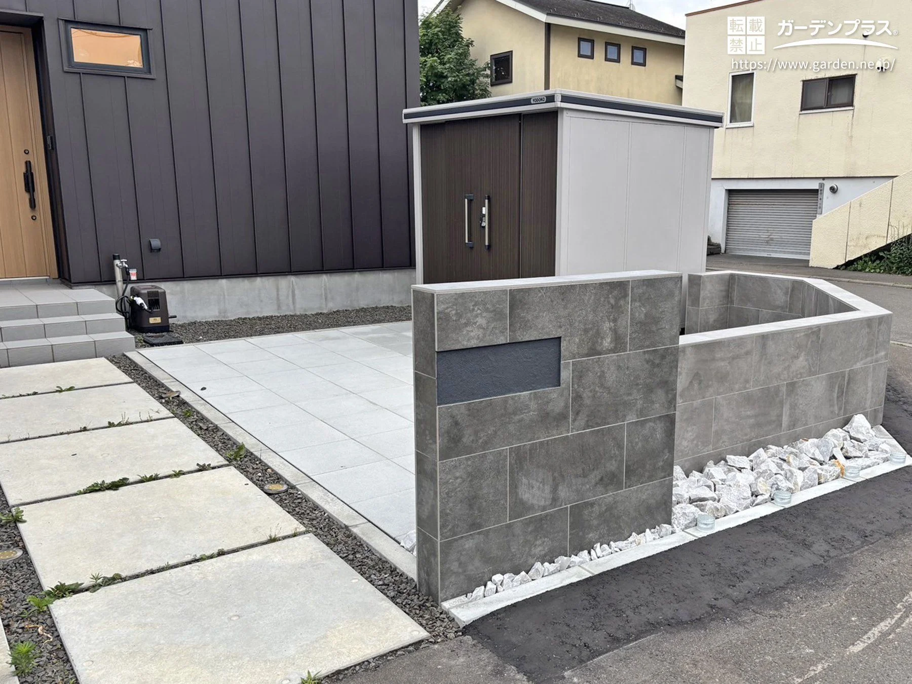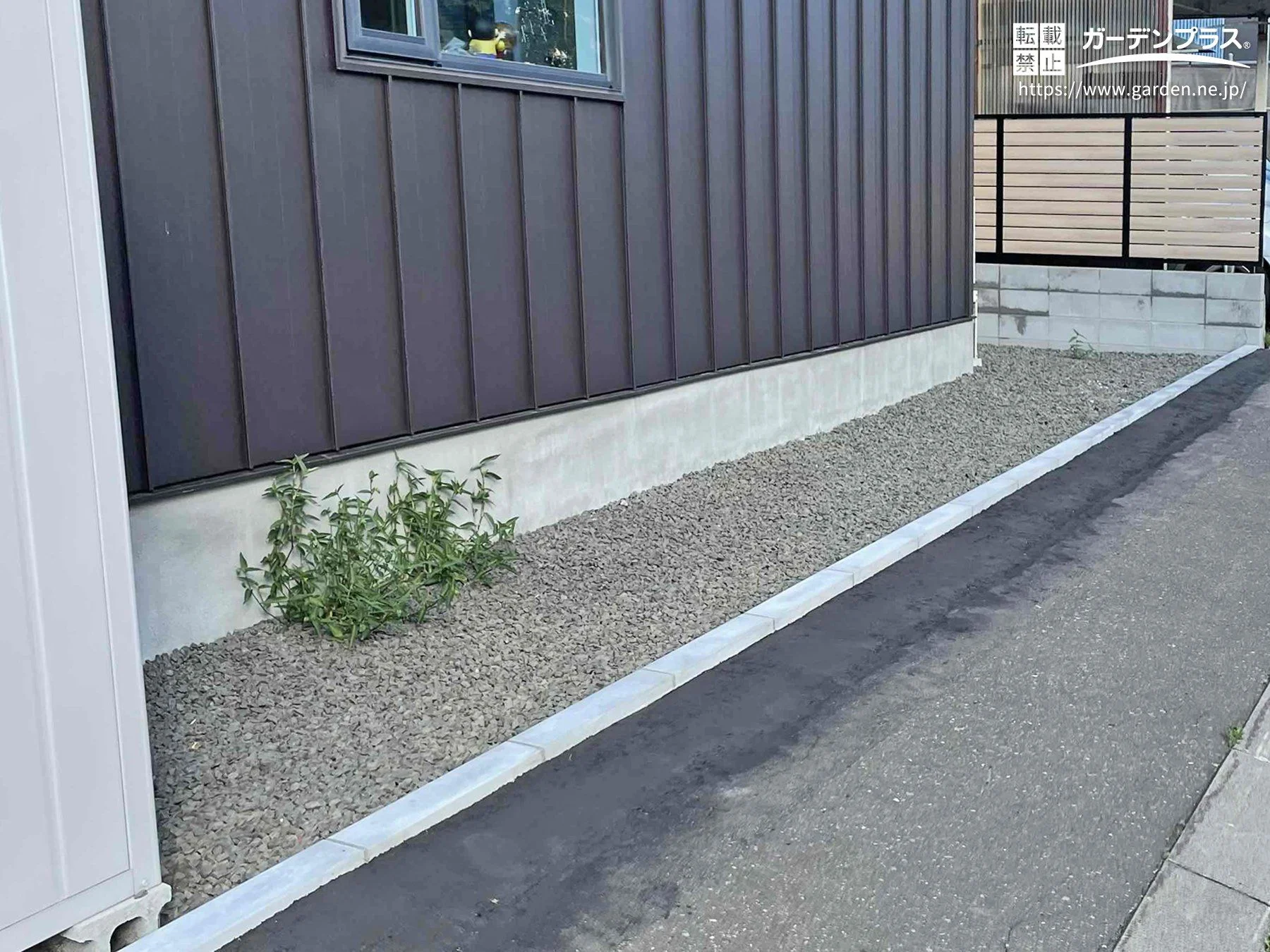 建物まわりには民地石で見切りを入れ、外構全体をすっきりと整理しました。敷地の境界が明確になるだけでなく、砂利の流出を防ぎます。直線的で無駄のないラインが、外壁のシックな雰囲気とも調和。日常の管理がしやすく、長くきれいな状態を保てる実用的な境界ブロックが仕上がりとなりました。