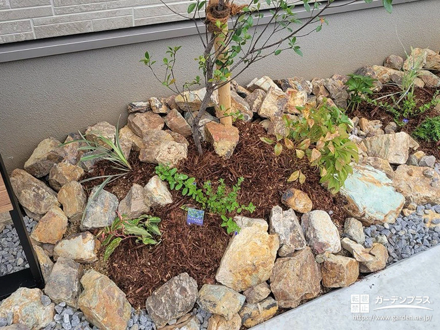 新築のお住まいの外構工事を承りました。木目とブラックを組み合わせた門まわりが外観を引き締め、乱形石のアプローチやロックガーデンが自然な彩りを添えます。人工芝やウッドデッキで快適に過ごせる主庭も確保し、ナチュラルな温かみとモダンなデザインが調和する外構に仕上げました。