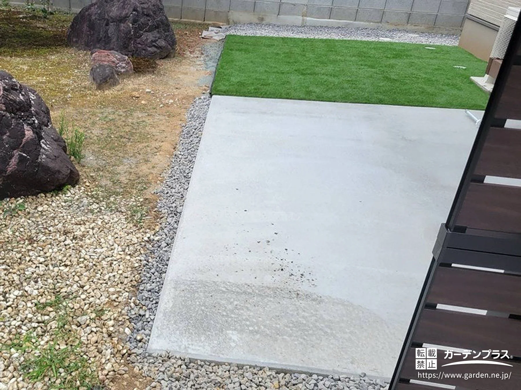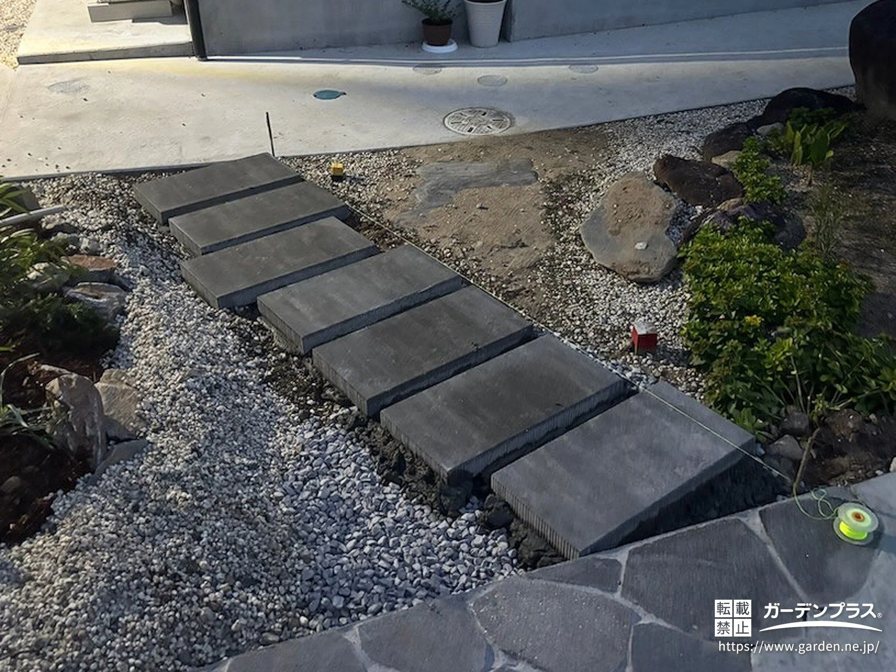 アプローチ:土間コンクリート + 乱形石張り クレモナストーン