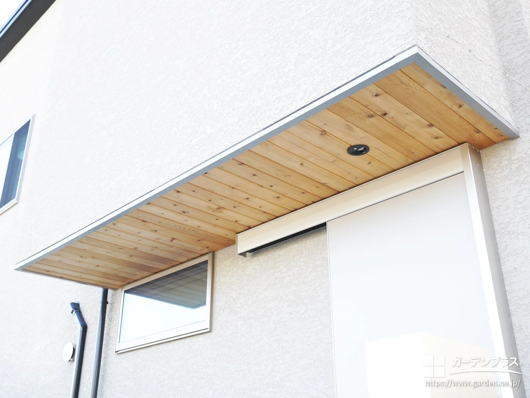 軒天の木目調と植栽が調和するナチュラルモダンな玄関まわり