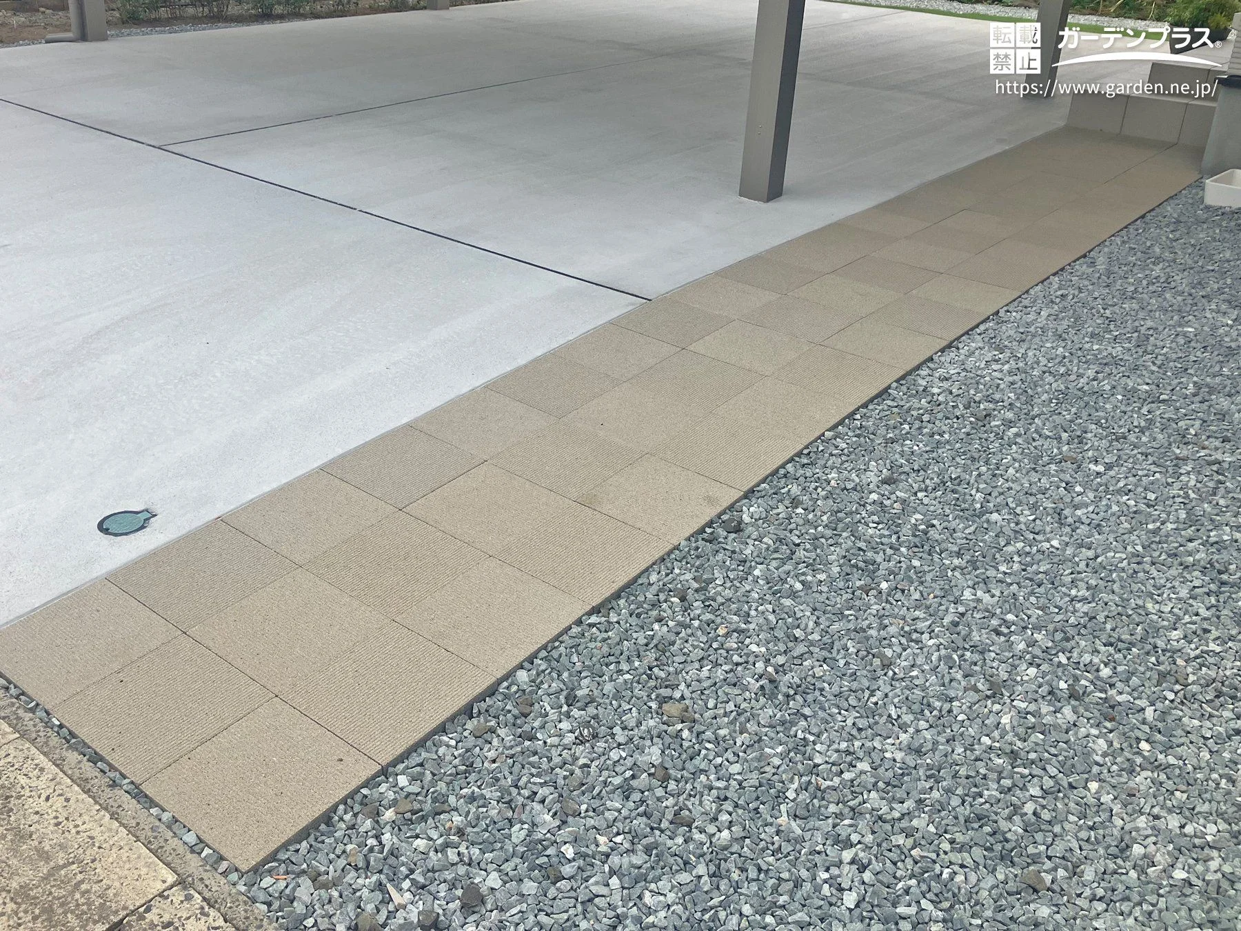 玄関前には表面に細い溝が入ったデザインのインターロッキング平板を敷き、落ち着いたアプローチをつくりました。規則正しい溝が陰影を生み、シンプルながらも上質な印象を演出します。