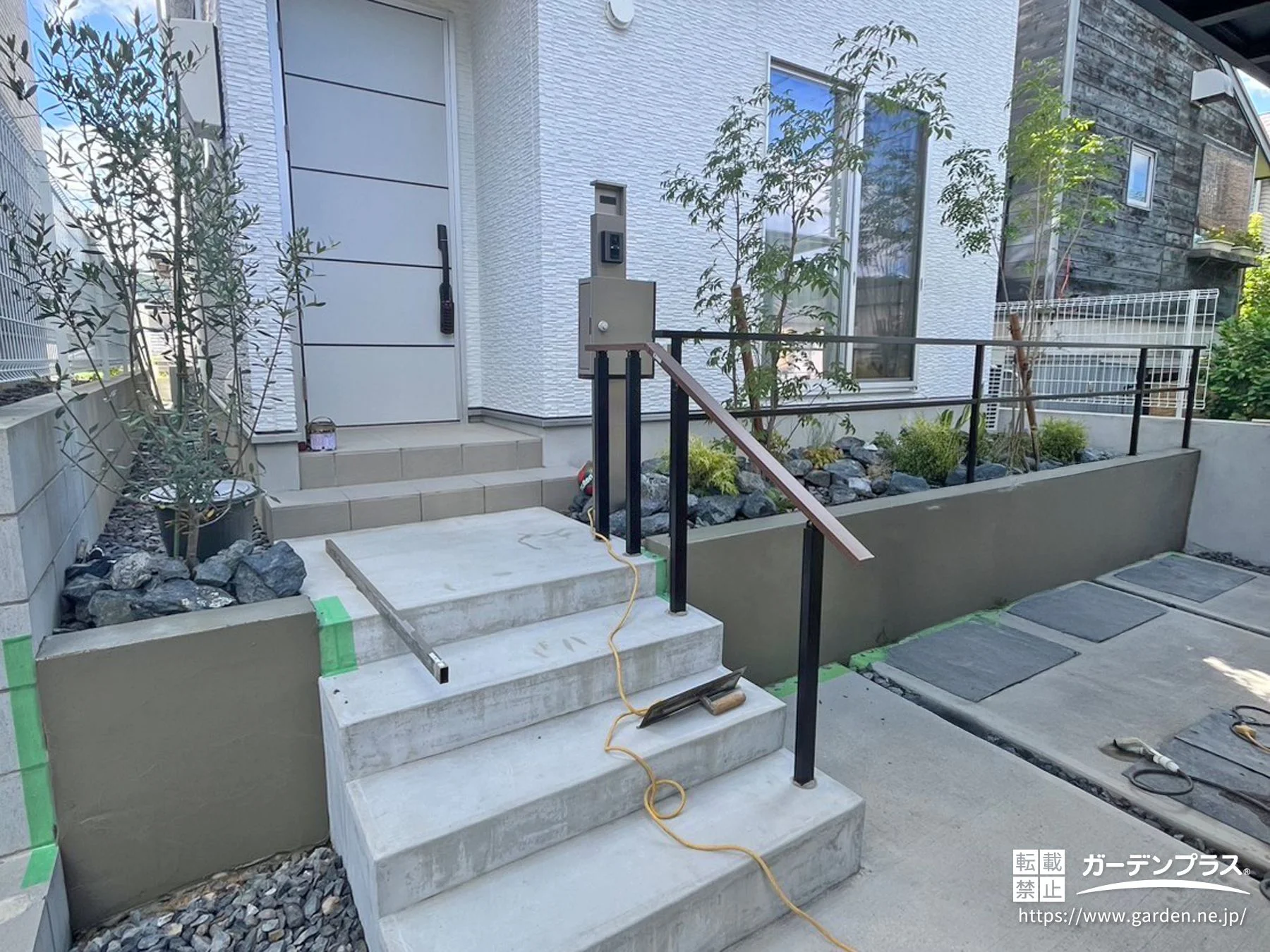 玄関まわりに手すりとフェンスを設置し、毎日の動線をより安心して使えるようにしました。階段部分には「アーキレール」を採用し、ブラックの柱と木調の笠木がモダンなアクセントに。アプローチ横にはシンプルさがおしゃれな「フレームフェンス」を合わせ、開放感を残しながら安全性を高めています。既存の土留めにはジョリパットで塗装仕上げとし、外観全体が明るくスタイリッシュな印象に生まれ変わりました