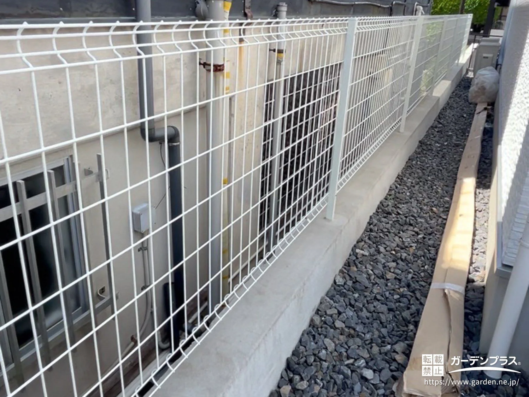 高低差のあった犬走り境界には、ホワイトカラーのメッシュフェンスを設置しました。シンプルで圧迫感が少ないため景観に溶け込みつつ、しっかりと安全性を確保。境界を明確にしながら、住まいの外観を明るく引き立てています。