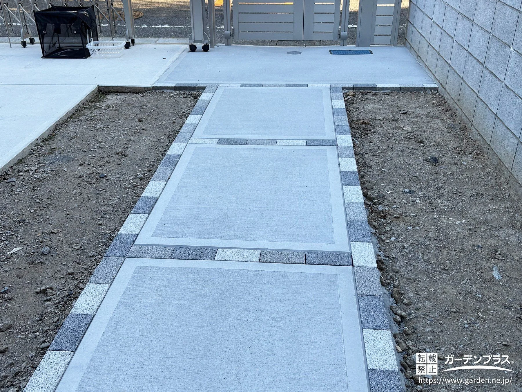 玄関アプローチ:土間コンクリート + インターロッキング目地