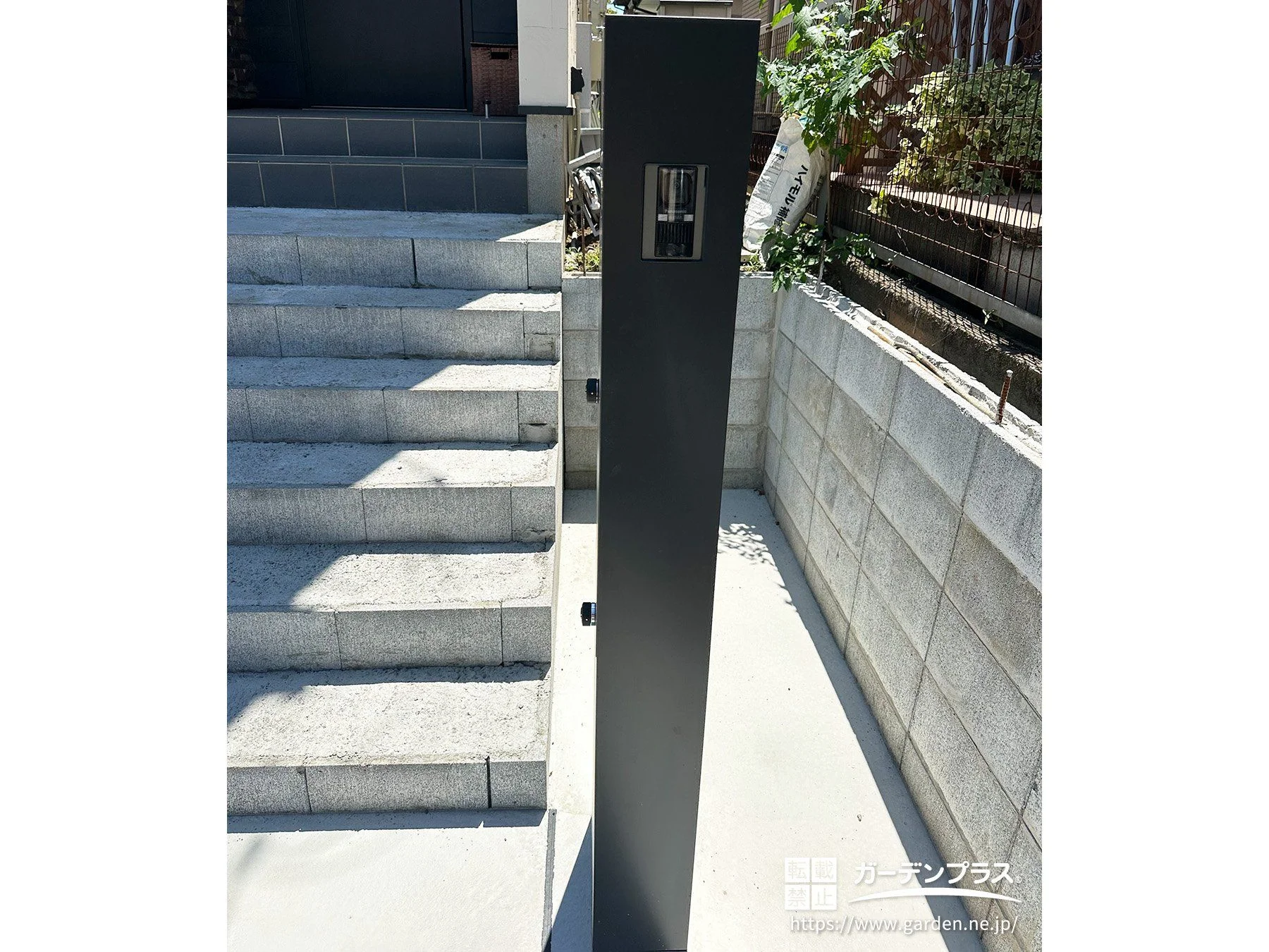 玄関前に機能門柱を設置しました。スリムな形状で生活動線の邪魔をしません。宅配ボックス付きのため、お留守の際も安心してお荷物の受け取りが可能です。