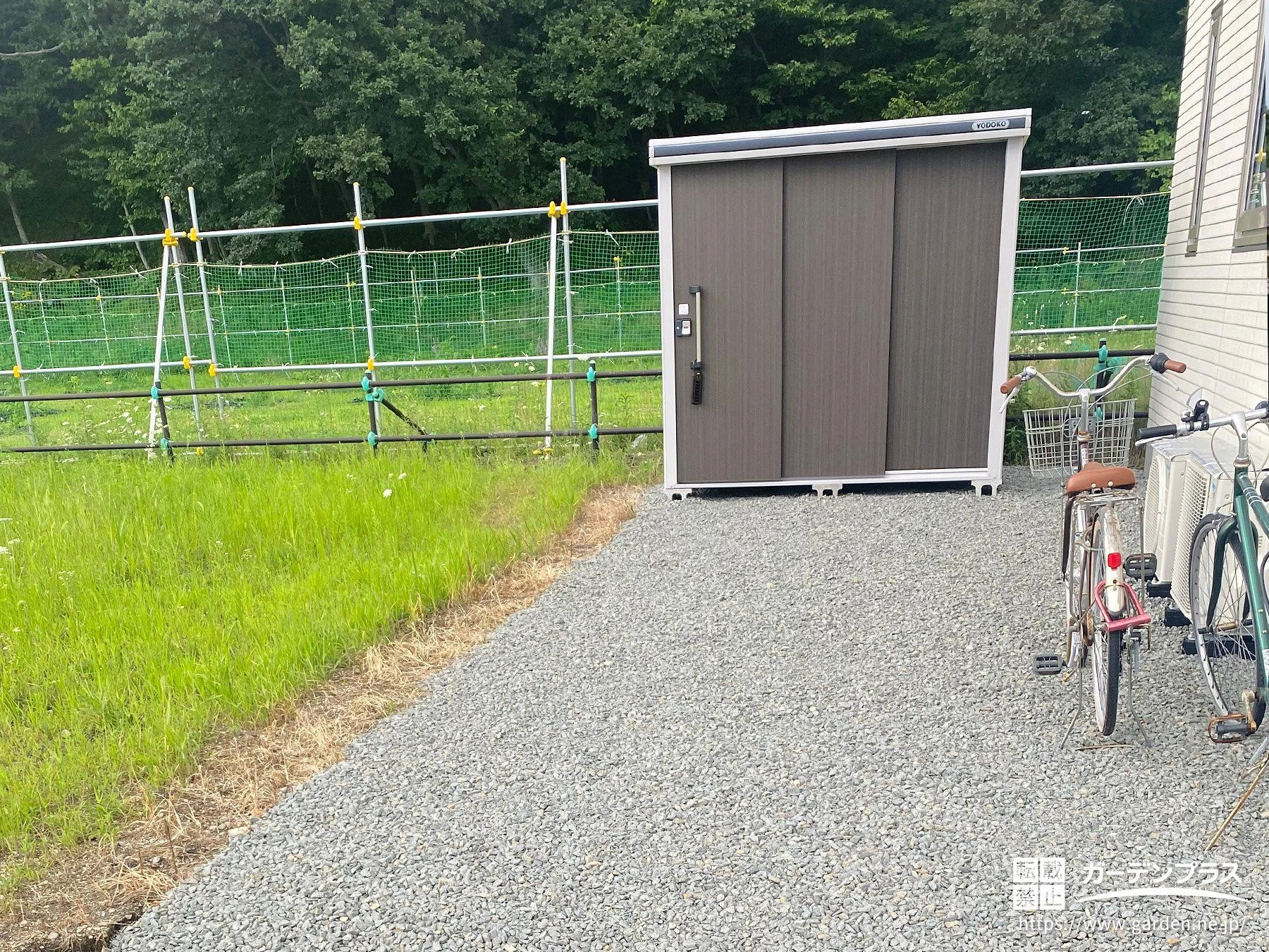 駐車スペースをアスファルトで敷設し、凍結や積雪による劣化が起きにくく安心してお使いいただける仕上がりとしました。見切りには民地石を設置し、舗装部分のラインがきれいに際立ち、駐車スペース全体がすっきりとした印象になっています。お庭は防草シートとビリ砂利を敷設し、雑草対策をしながら明るい空間に整えました。一画には物置を設置しているため、園芸用品やアウトドアグッズなどをしっかり収納でき、日々の暮らしに便利さをプラスしています。駐車・収納・防草と、それぞれの機能性を考えた実用的で安心感のある外構が完成しました。