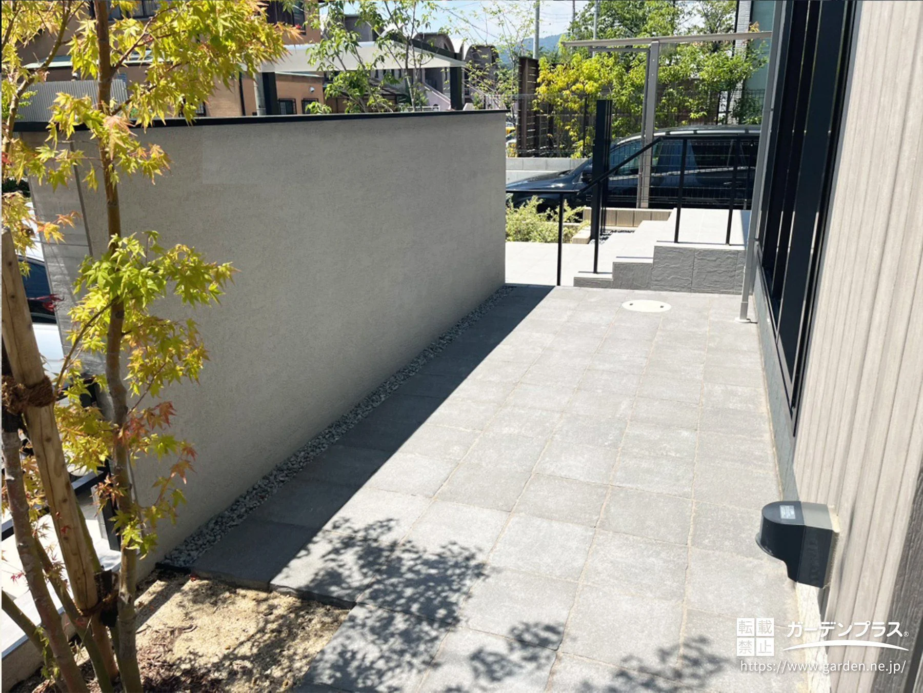 お客様からの「外からの視線をしっかり遮りたい」「限られた敷地を有効に使いたい」「建物と調和する色味でまとめたい」というご要望に応え、全体をグレー基調で整えたモダンな外構をご提案しました。目隠しには既製のアルミフェンスではなく、タイルを用いた造作塀を採用。門柱とのつながりを意識したデザインで、後付け感のない一体感を演出しています。併せて法面を整えたことで、内側にはインターロッキングテラスが広がり、お子様のプール遊びなども安心して楽しめる空間に。さらにガーデニング好きなお客様のために花壇を設け、フレームフェンスを組み合わせて植栽を魅せる景観もデザインしました。視線を遮りつつ空間を活かすオープン外構の目隠しリフォーム工事です。