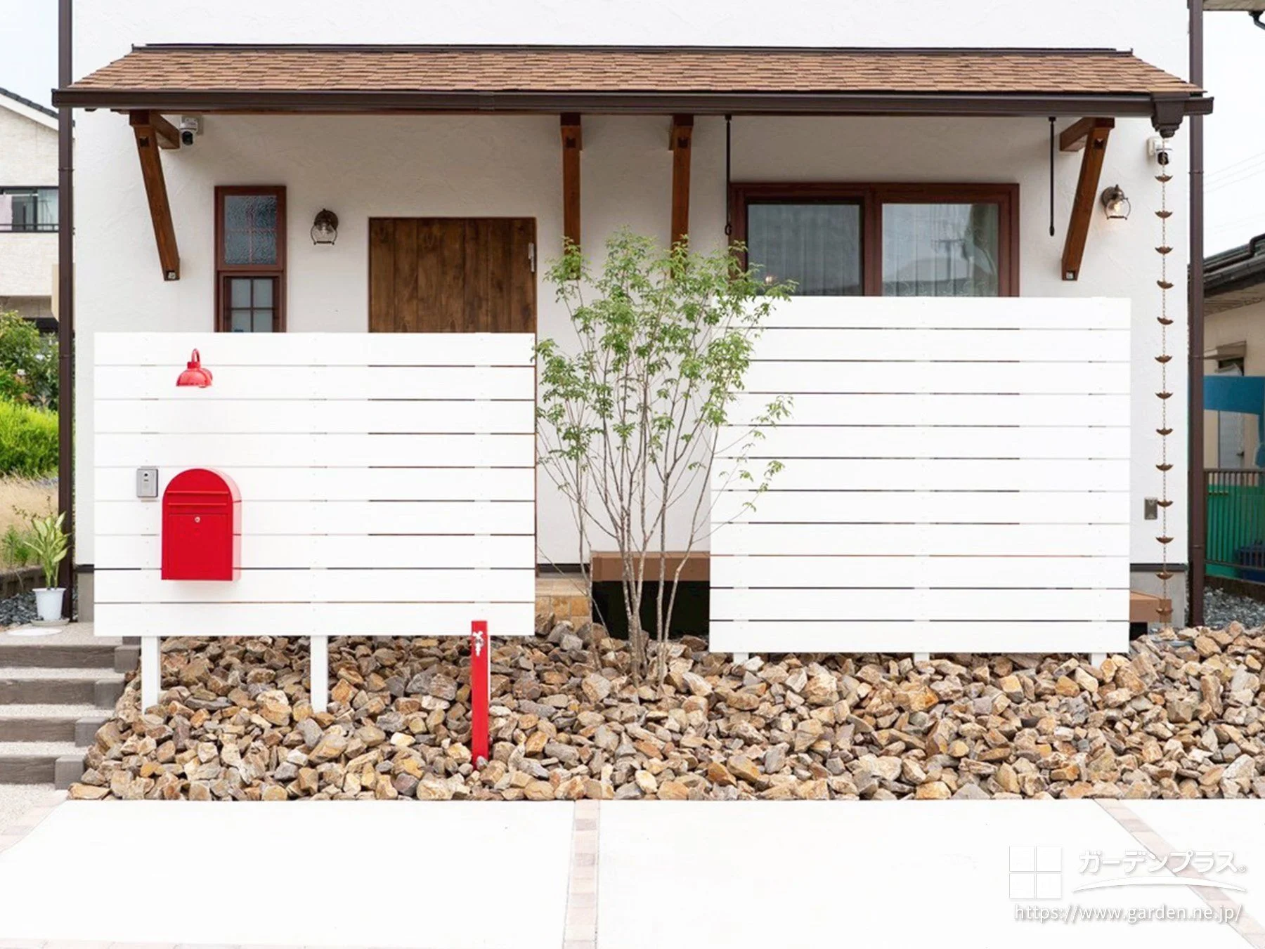 白いフェンスと赤いアクセントが映える洋風ナチュラルな新築外構